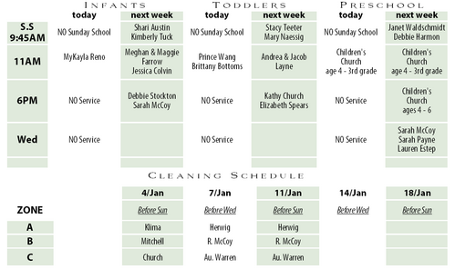 There will be no Wednesday evening service this week. Our normal Wednesday schedule resumes January 7th.